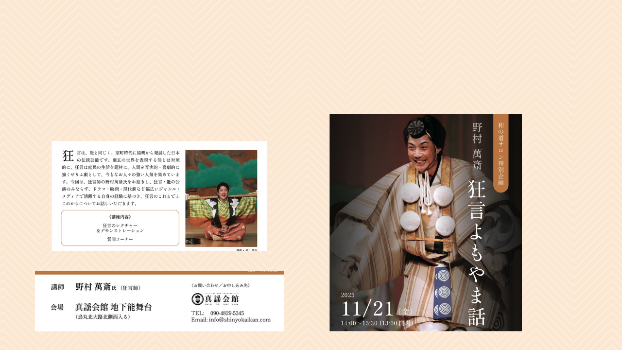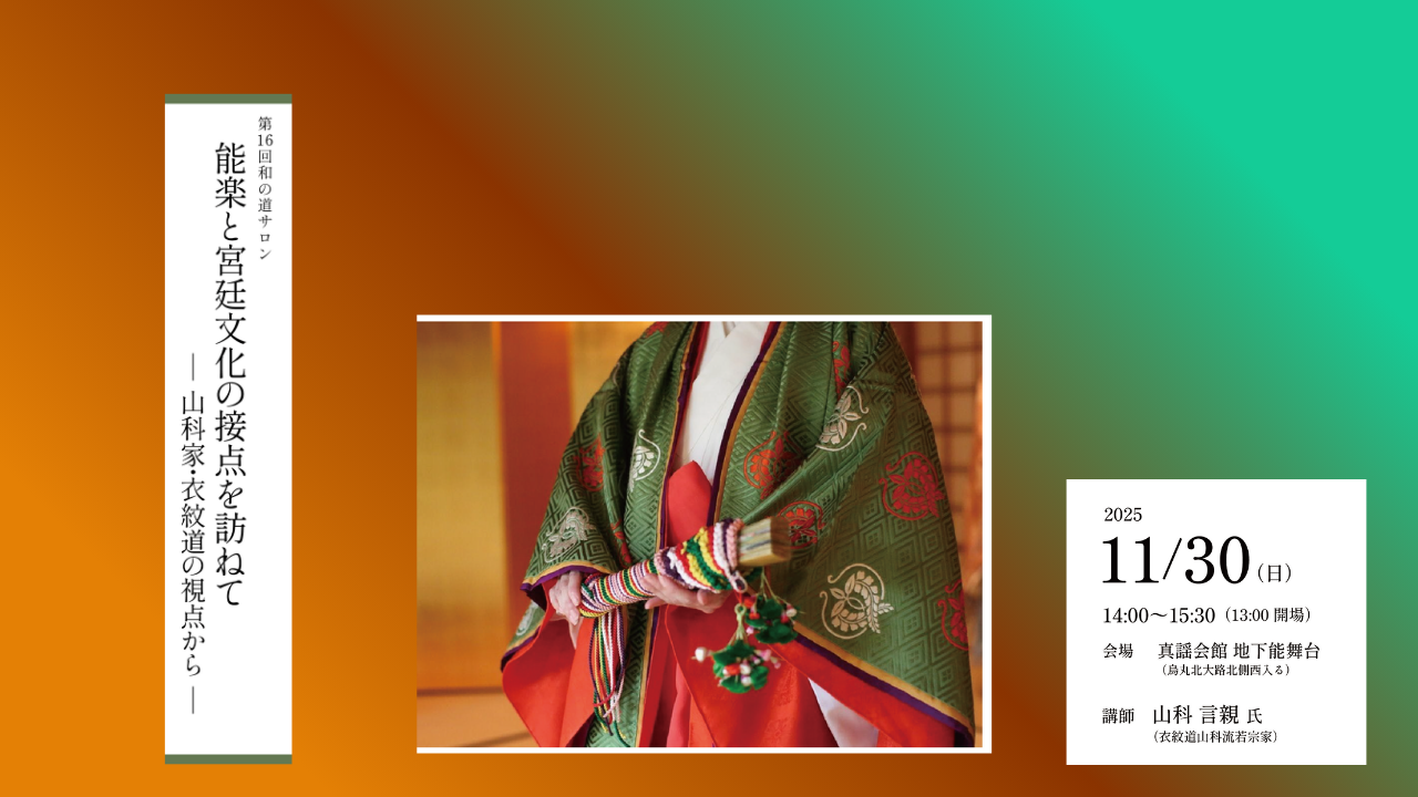 ここを訪れるすべての方々に、文化・芸術との出会いを通して豊かな学びと憩いの時間を過ごしていただけるよう、能の公演や伝統文化ワークショップとして和の道サロンの開催、また、謡曲、仕舞、茶道のお稽古を致しております。
