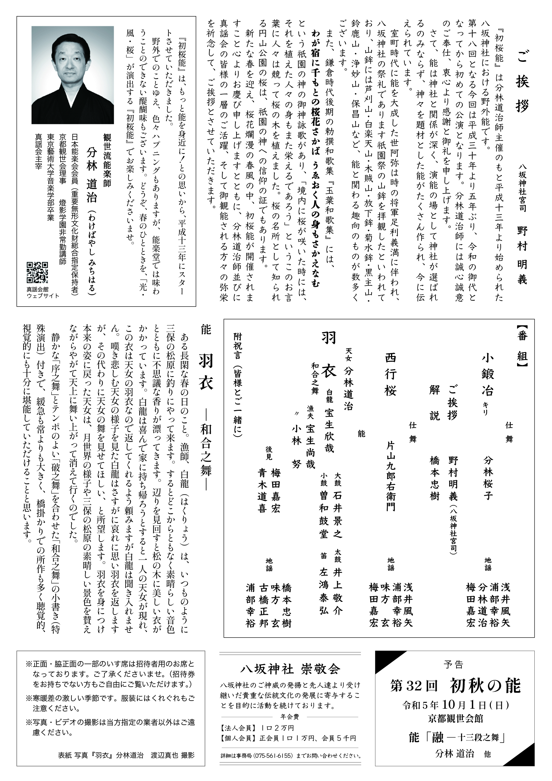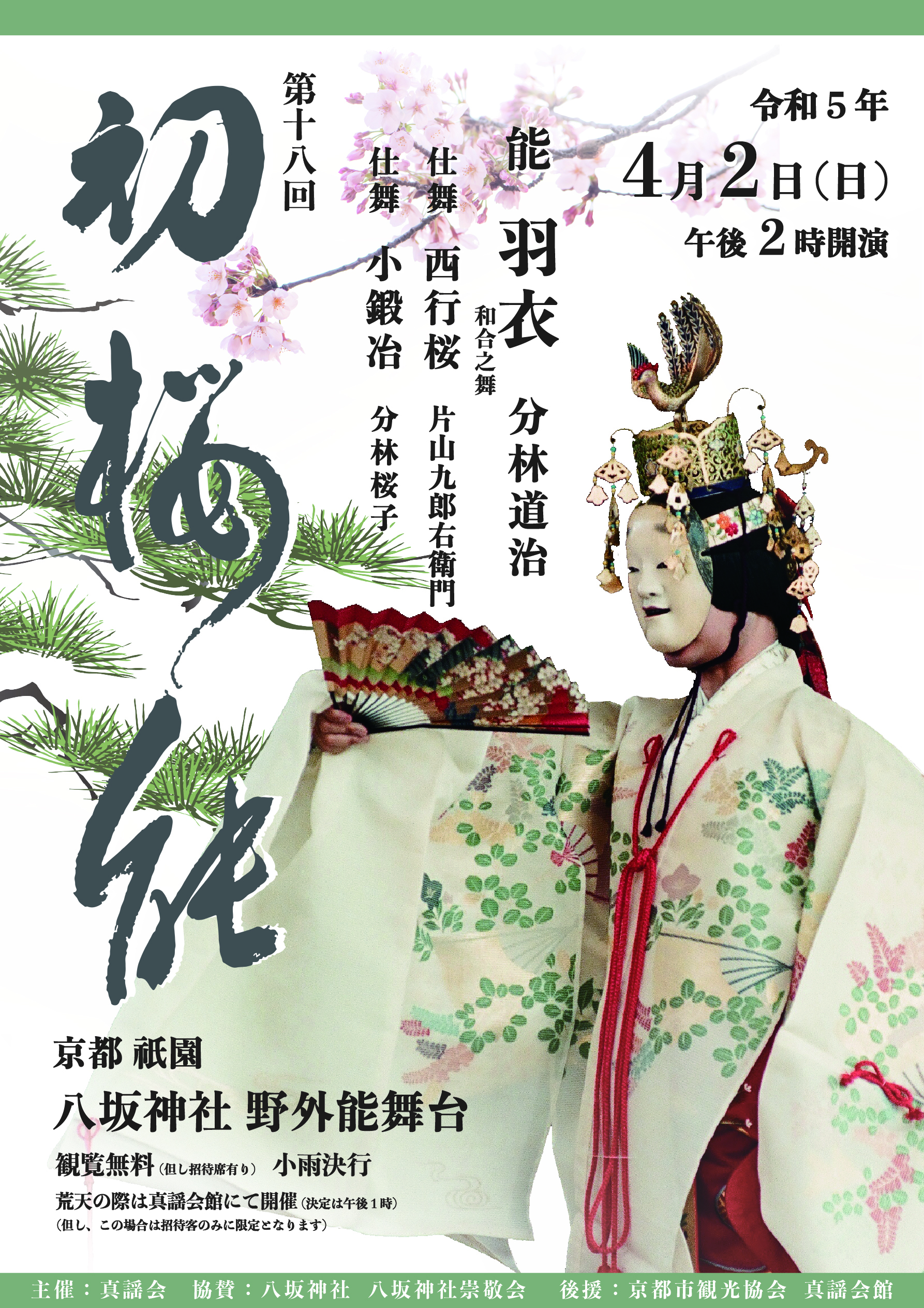 本年4月、京都・八坂神社野外能舞台にて、真謡会主催、真謡会館後援によります「初桜能」が開催されます。