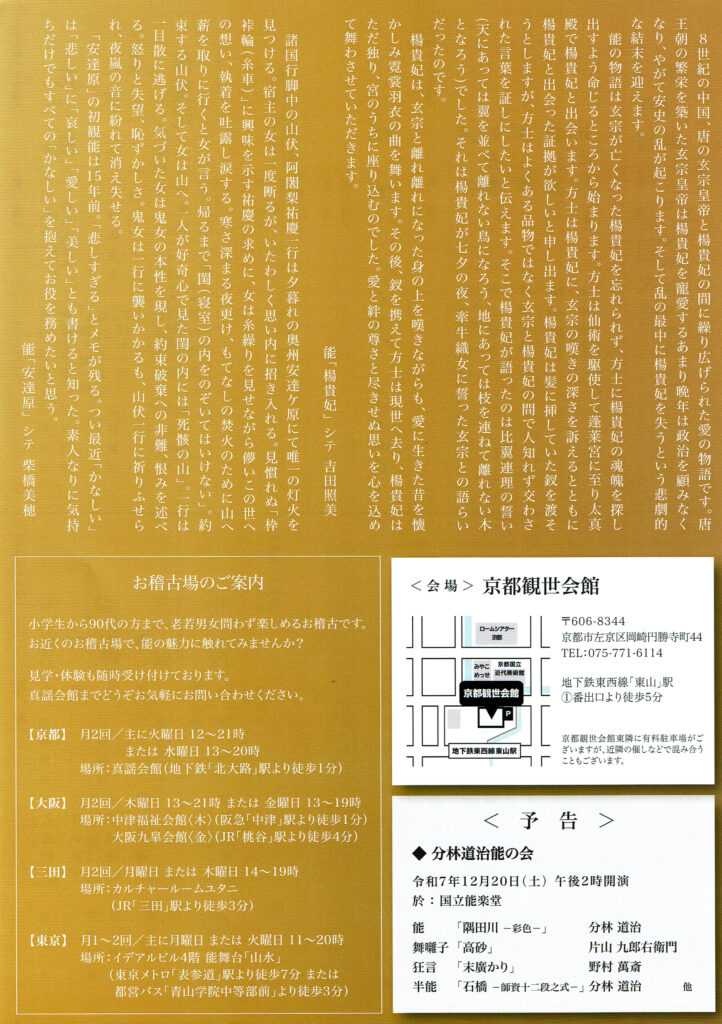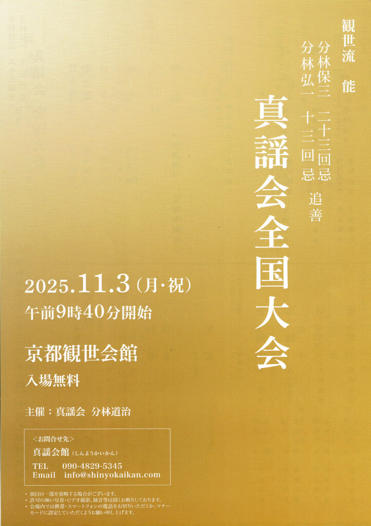 11月3日(月•祝) 真謡会全国大会 於:京都観世会館 2025年10月18日 最終更新日時 : 2025年10月18日 shinyokaikan 11月3日 午前9時40分開始 入場無料です。どうぞお気軽にお越しください。 2階に呈茶席をご用意しております。どうぞお立ち寄りいただき、ホームページをご覧になった旨をお伝えくださいませ。一服差し上げたく存じます。 FacebookXBluesky
