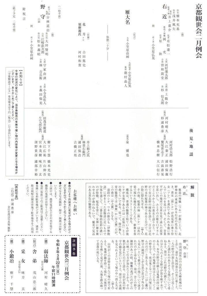 京都観世会二月例会 令和8年2月22日(日) 11時開演